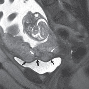 placenta accreta with outer bulging of the placenta (“p,” a)